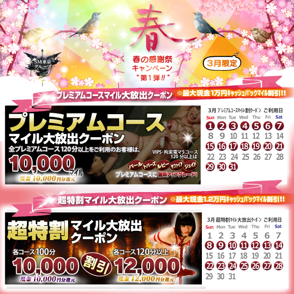 【現金最大1万円分をマイル割引!!】春の大感謝祭としまして、期間限定のお得なクーポンを配信!